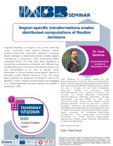 Cognitive flexibility is thought to rely on control from the prefrontal cortex, yet recent evidence suggests that information for flexible decisions is widely distributed across multiple brain regions. Dr. Barbosa will tackle this complexity by analyzing the dynamics within and between six brain regions in a context-dependent decision-making task. Using population analyses and data-constrained Recurrent Neural Networks (RNNs), his work reveals that despite task variables being broadly encoded, each region performs different computations during flexible decision making. This work moves beyond classical decoding to show how progressive, abstract transformations enable complex behavior.